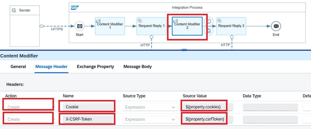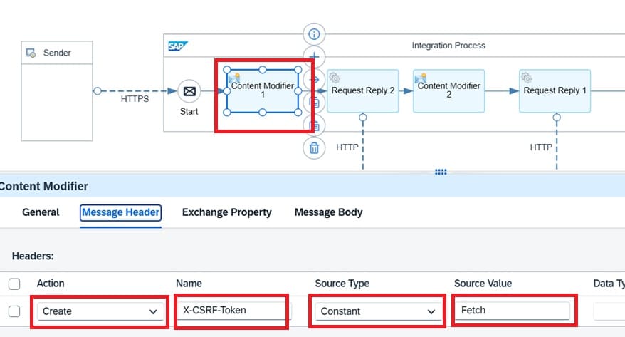 Content Modifier 1 is used to maintain "X-CSRF-Token" key as HTTP header with value "Fetch". This is required for the purpose of getting X-CSRF-Token from backend S/4 HANA on which the OData API will be called.