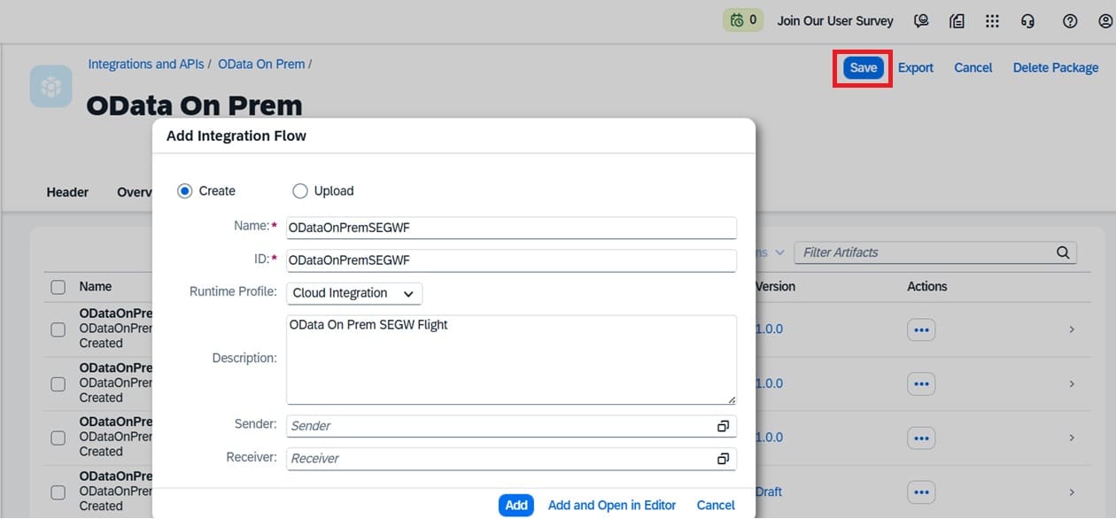 A popup screen is shown up. Fill in details of the iFlow on the popup menu and click "Save" button.