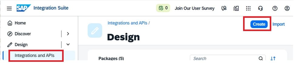 Login to SAP Integration Suite. Click on "Design" -> "Integrations and APIs" -> "Create".