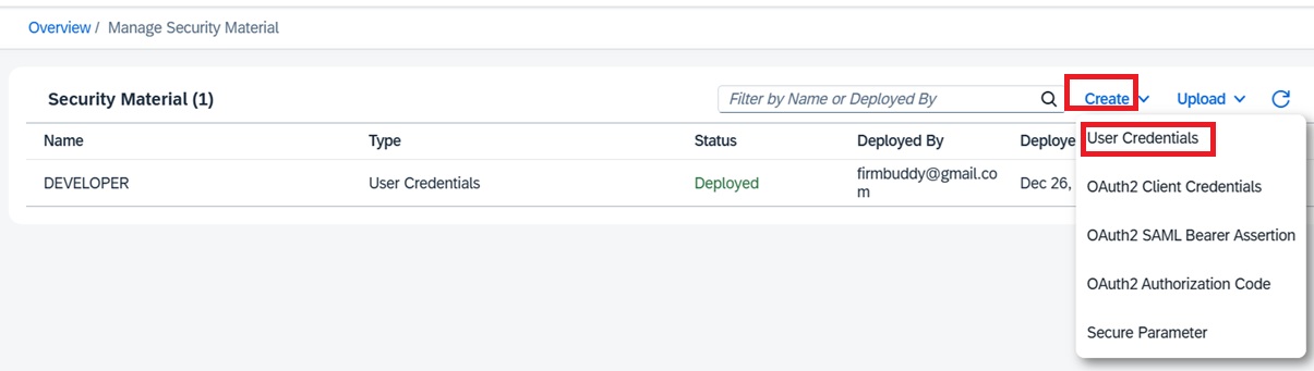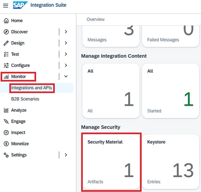 To add User Credential on SAP Integration Suite, please follow the following procedure. Log in to SAP Integration Suite. At left pane menu drop down "Monitor" -> "Integrations and APIs" -> Manage Security -> Click on Security Material: