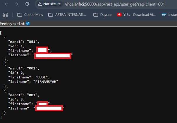 Testing can also be performed using tools such as Postman. Use the same endpoint URL obtained by right-clicking the SAP Gateway service: http://vhcala4hci:50000/sap/rest_api/user_get?sap-client=001